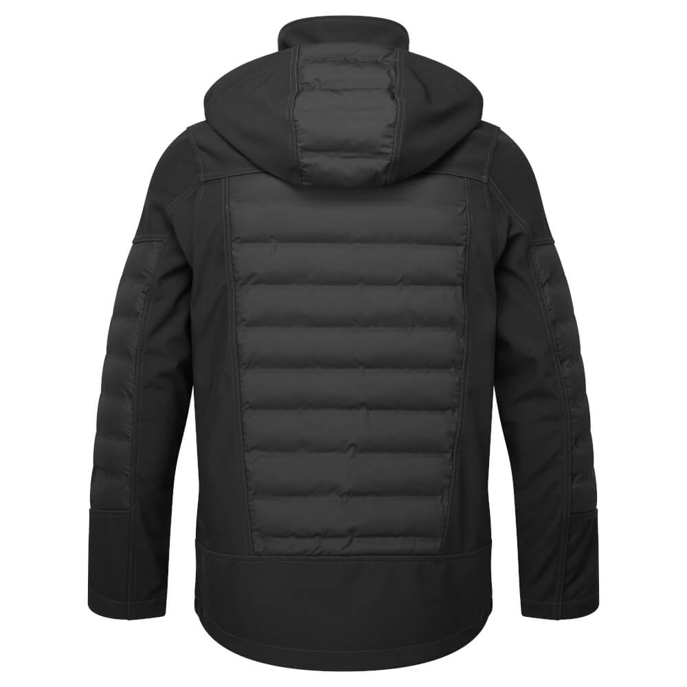 A unisex hybrid softshell workwear jacket made from recycled fibres, featuring water-repellent protection, padded panels, reflective detailing, and a detachable hood for all-day comfort and performance.